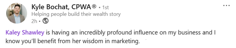 From personalizing my website to organizing events, parties, and content creating/managing my social media, Kaley is the absolute best. She is extremely knowledgeable and stays up to date on current marketing trends. Her creativity is unmatched! The encouragement she has given me to help bring my dreams to life is unmeasurable. She is the absolute best!